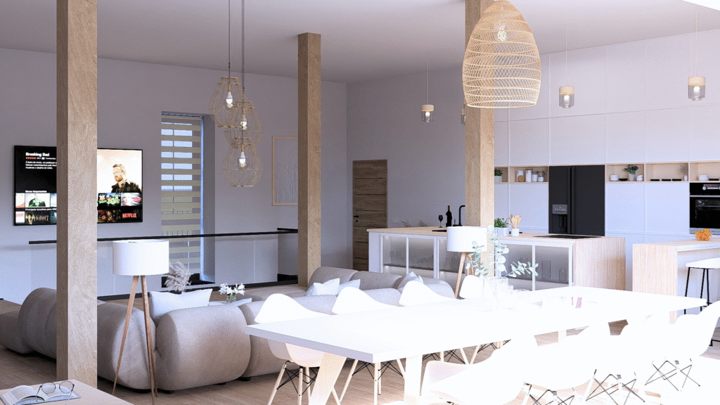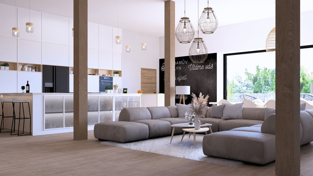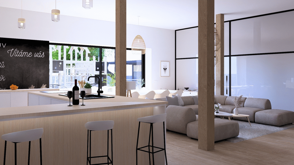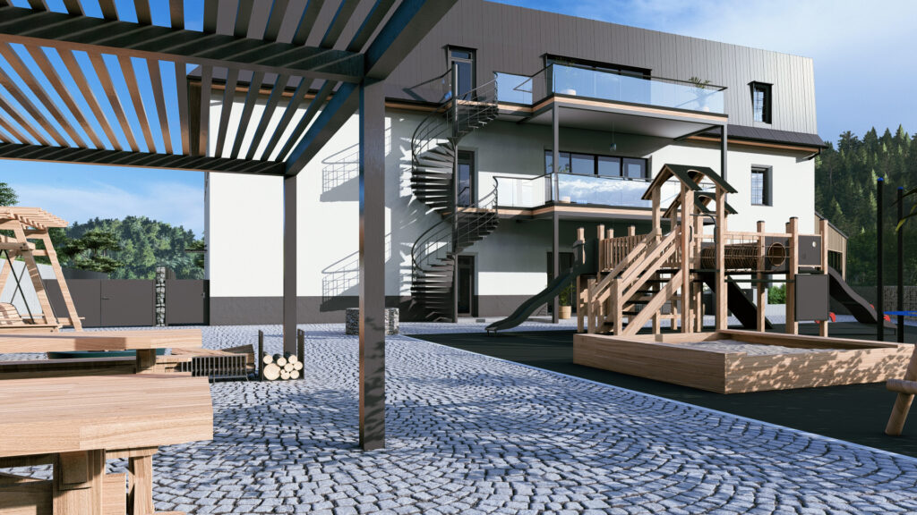 Najdete zde zádveří, společný obývací prostor s kuchyní, jídelnou a hernou a celkem 3 pokoje se samostatnými koupelnami a toaletou (2x mezonetový pokoj a 1x standardní pokoj).