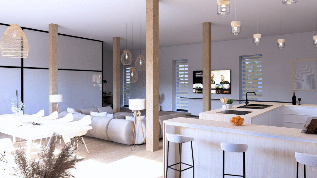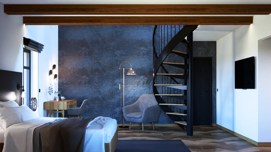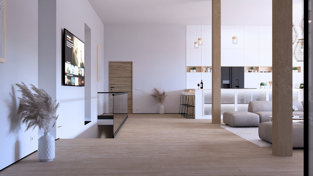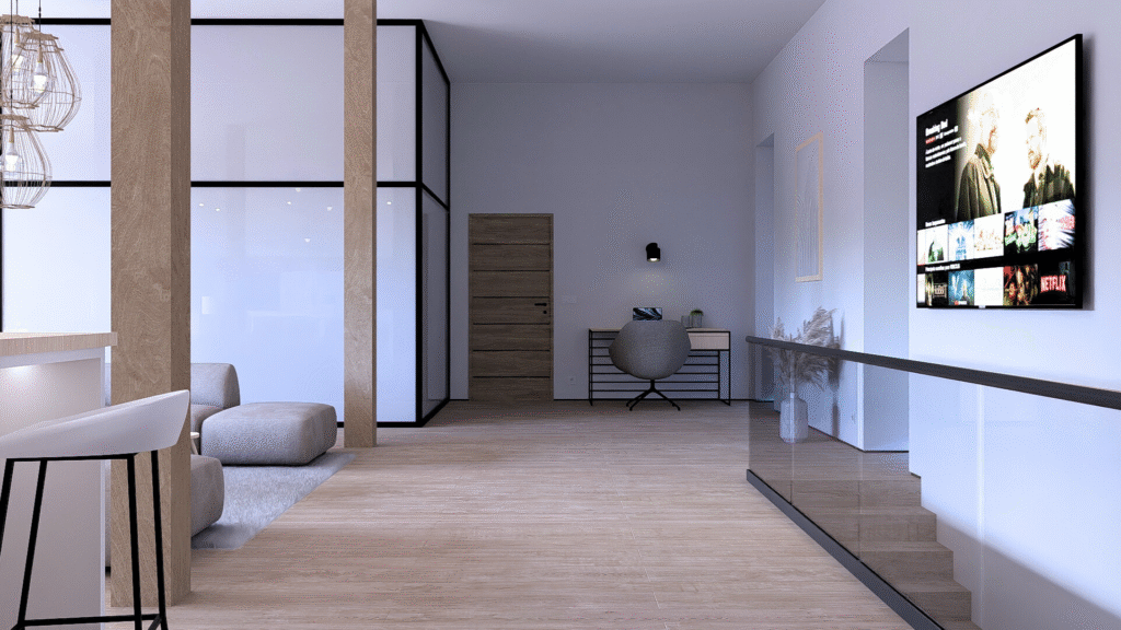 Ve 3 NP se na ploše 260 m² nachází nejprostornější mezonetový byt, který je již stavebně dokončen, vymalován a připraven k instalaci interiérových zařizovacích prvků. Interiér nabídne nadstandardní zázemí s promyšleným řešením každého detailu.