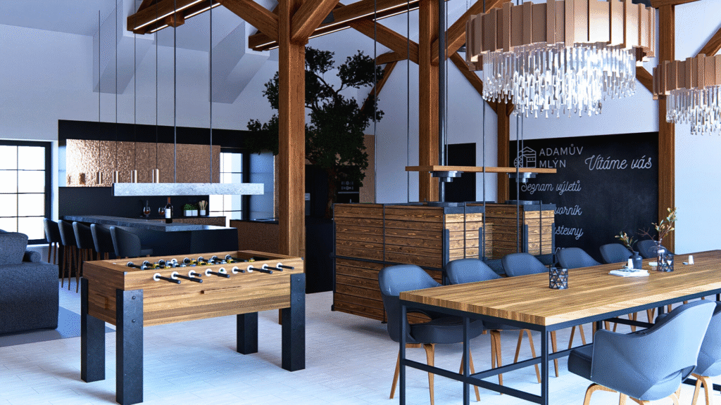 Ve společných prostorách byl ponechán prvek z původního strojního vybavení mlýna, který může vyniknout v novém interiéru jako historický solitér.